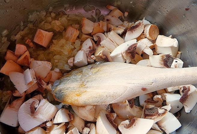 Em uma panela, acrescente uma colher de sopa de azeite de oliva e a colher de sopa de manteiga, acenda o fogo em temperatura média-baixa. Uma vez quente adicione a cebola, o alho, o alho-poró e os cogumelos, tempere a gosto e abaixe o fogo. Deixe cozinhar em fogo baixo durante 15 minutos, pois os vegetais devem ficar bem escaldados e soltar seus sucos e sabor.