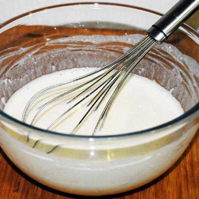 Agora, coloque o leite e bata tudo. Quando os ingredientes estiverem bem integrados, acrescente o azeite à massa de crepes e continue mexendo.