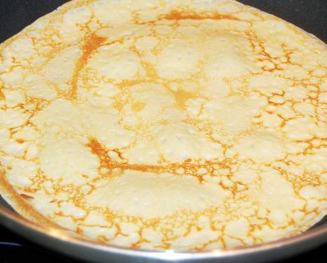 Agora, com a ajuda de uma colher, pegue um pouco de massa e verta-a sobre a frigideira para fazer o crepe sem ovo um por um. Os crepes fazem-se muito rápido, de maneira que assim que a massa se torne sólida e apareçam pequenas borbulhas, vire-a, e deixe-a alguns segundos para dourar essa parte e retire. Repita esse processo com o resto da massa.