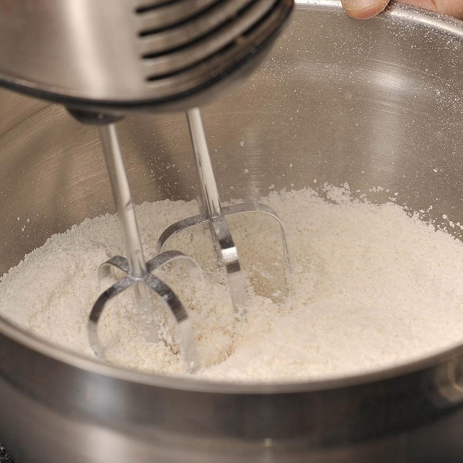 Neste segundo recipiente deverá misturar a farinha, previamente peneirada, com o açúcar. Depois, acrescente a manteiga e bata tudo. É aconselhável que a manteiga esteja à temperatura ambiente para que seja mais fácil misturar com a farinha. Se desejar, pode acrescentar uma pitada de sal.