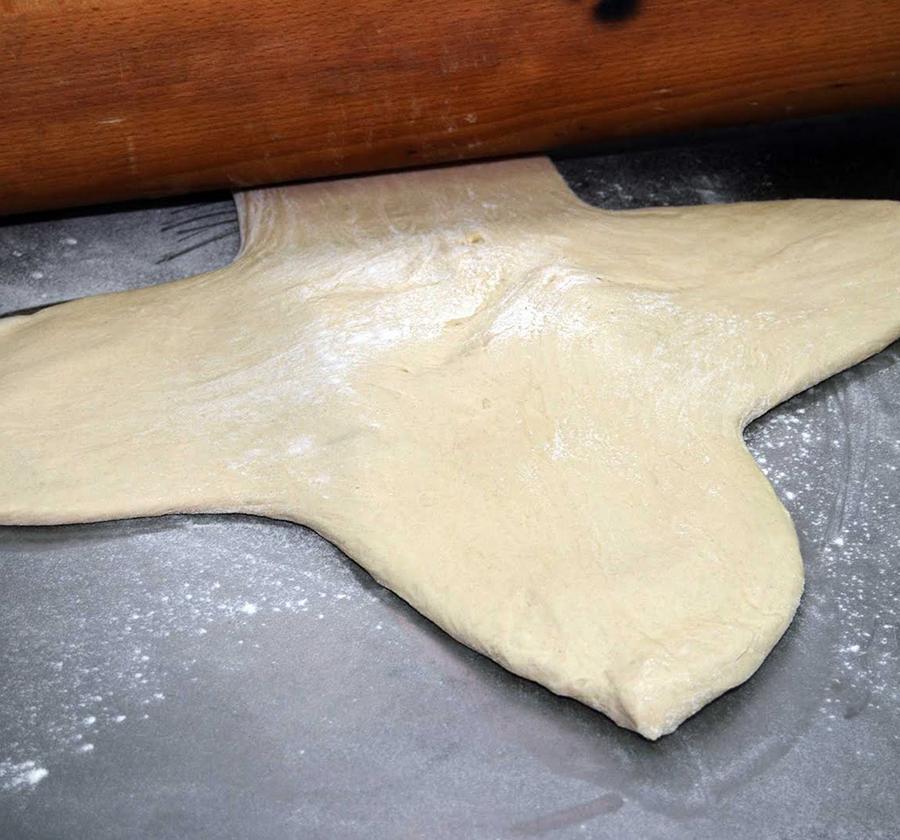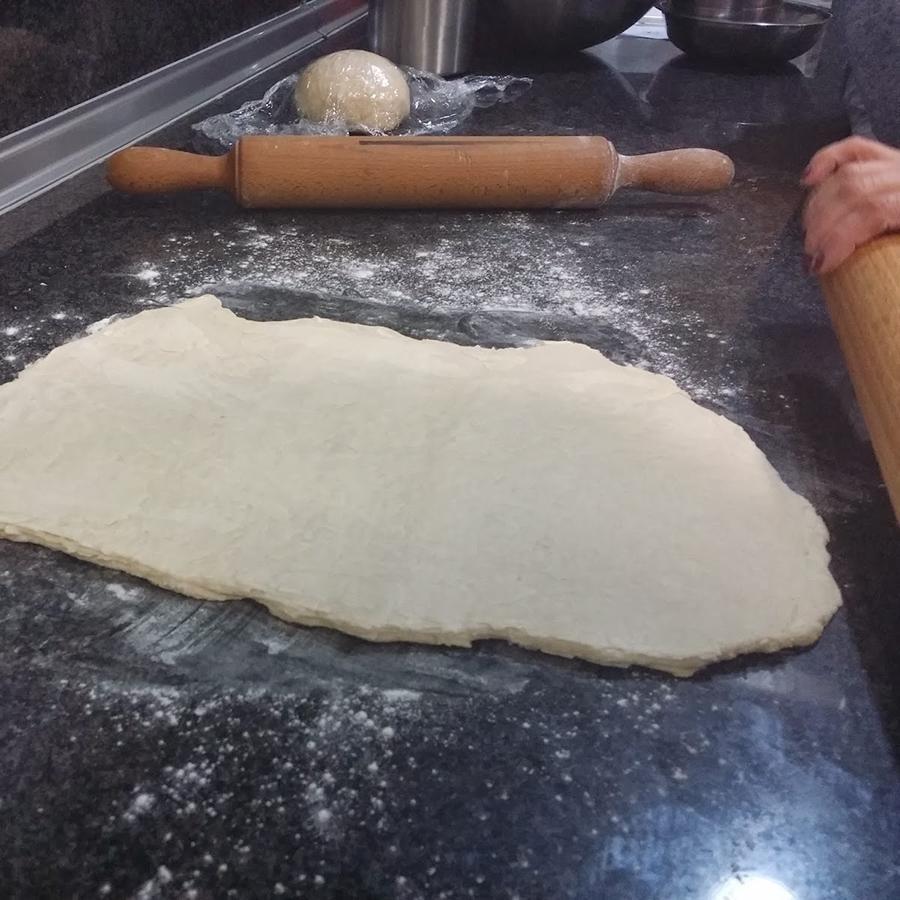 Quando tiver a massa pronta, faça uma bola, coloque-a na vasilha que usou antes, cubra com um pano limpo e deixe repousar durante 2 horas. Passado o tempo, volte a amassá-la, faça uma bola e faça um corte em cruz sobre ela. Agora, com um rolo, estique a massa seguindo a cruz. Fazemos isso porque deveremos dobrar várias vezes a massa, como fazemos com a de massa folhada.