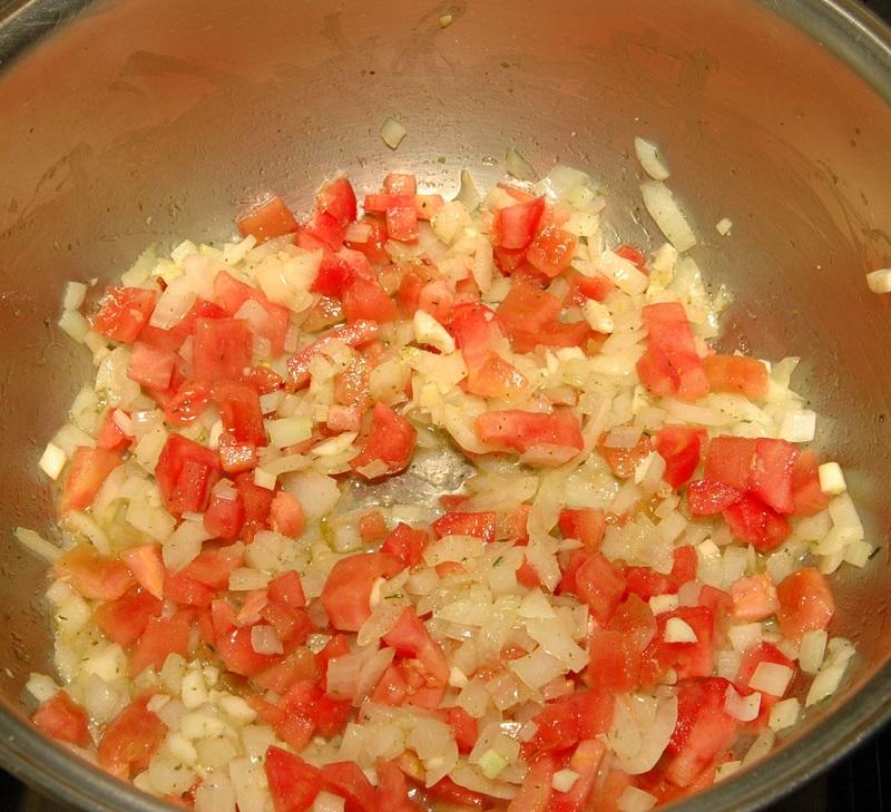 Leve ao fogo uma panela grande com o óleo, as cebolas, os tomates e os pimentões e deixe refogar.