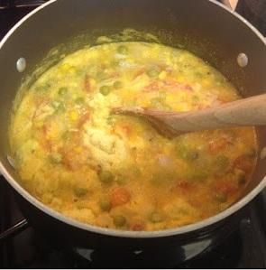 Quando a cebola estiver dourada, junte o palmito, a sardinha ou atum, as ervilhas, o molho de pimenta, o milho verde e os tabletes de caldo, mexendo até que estes se dissolvam. Tempere com sal a gosto e cheiro verde.