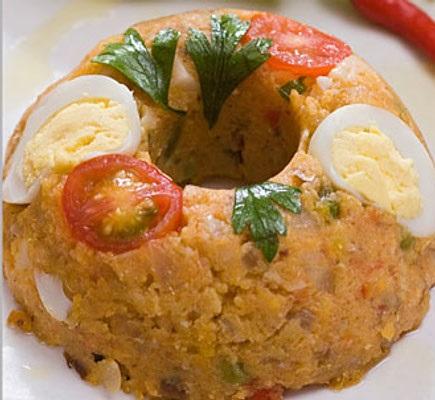 Numa forma de bolo com furo no meio, coloque fatias de ovo cozido, tomate cru e palmito em fatias também. Estes ingredientes servirão como decoração do cuscuz, pelo que são opcionais.