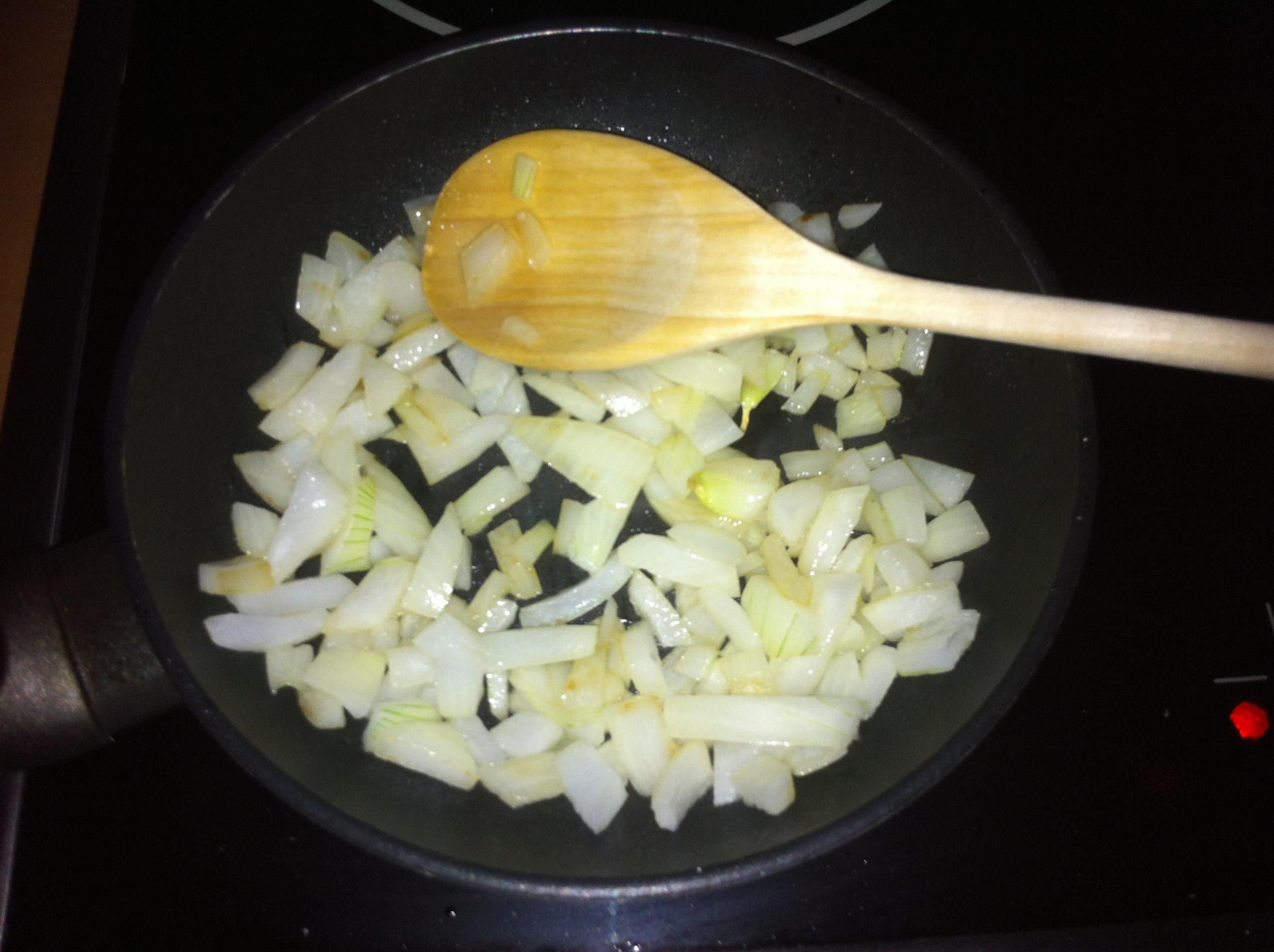 Ponha uma cebola picada em um pouco de azeite bem quente em uma frigideira. Mexa continuamente para evitar que queime.