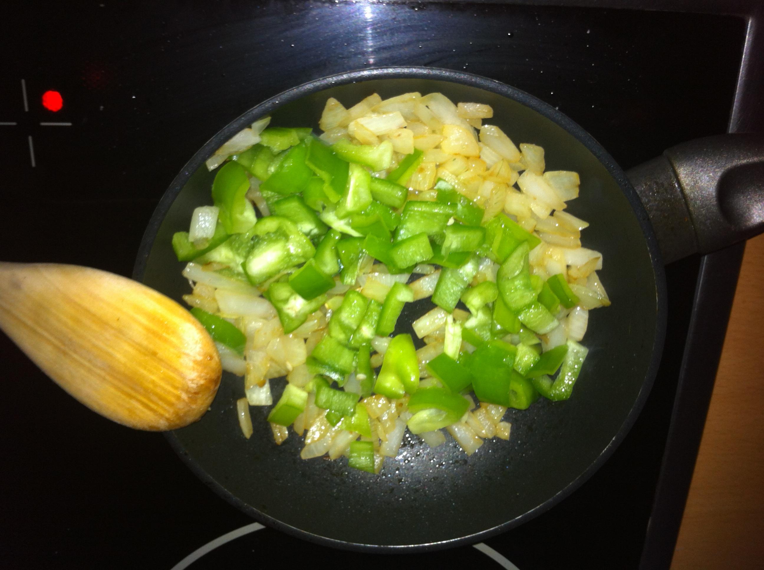 Quando a cebola estiver dourada, acrescente um pimentão verde picado. Continue mexendo para não queimar.