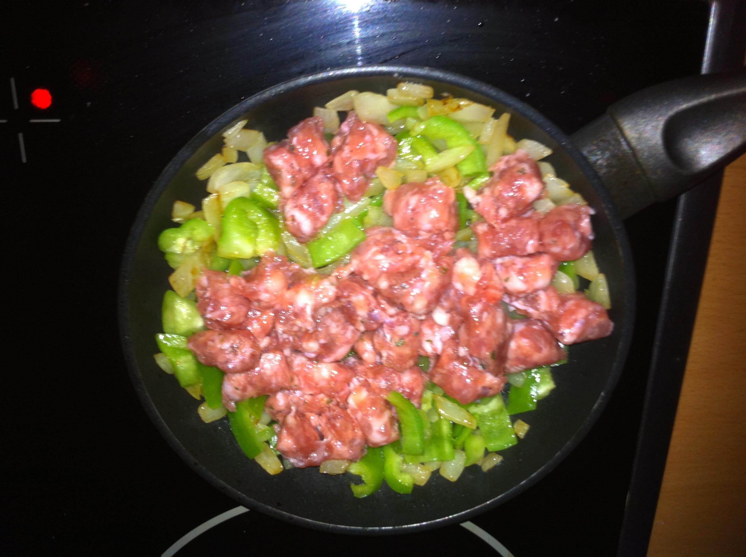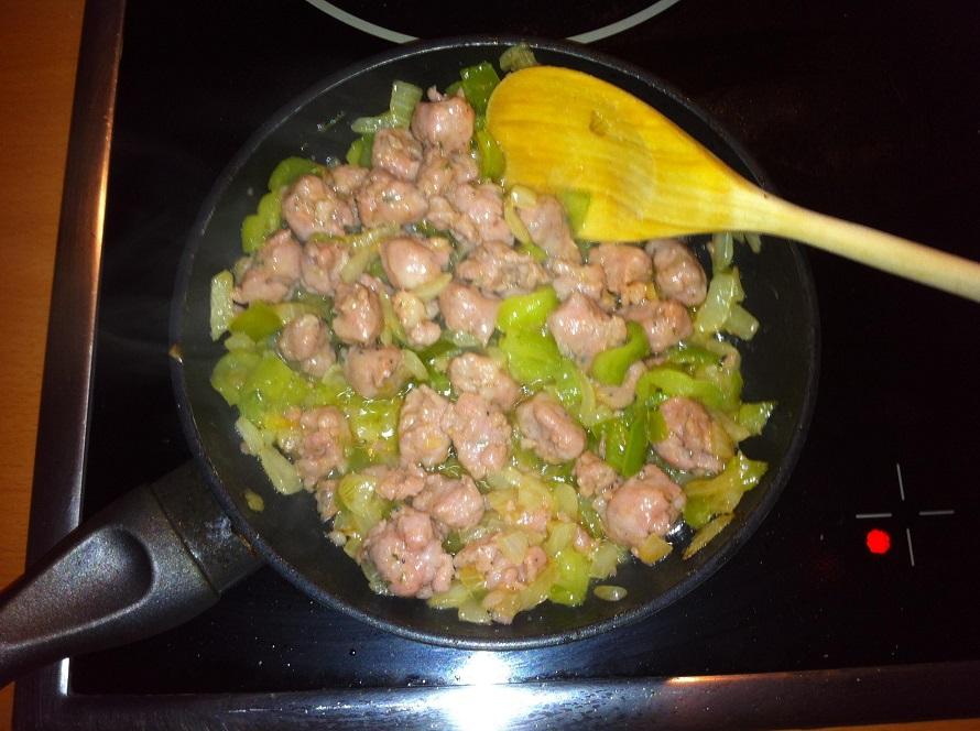 Quando a cebola e o pimentão estiverem prontos, acrescente quatro salsichas picadas à frigideira. Mexa até que estejam prontas.