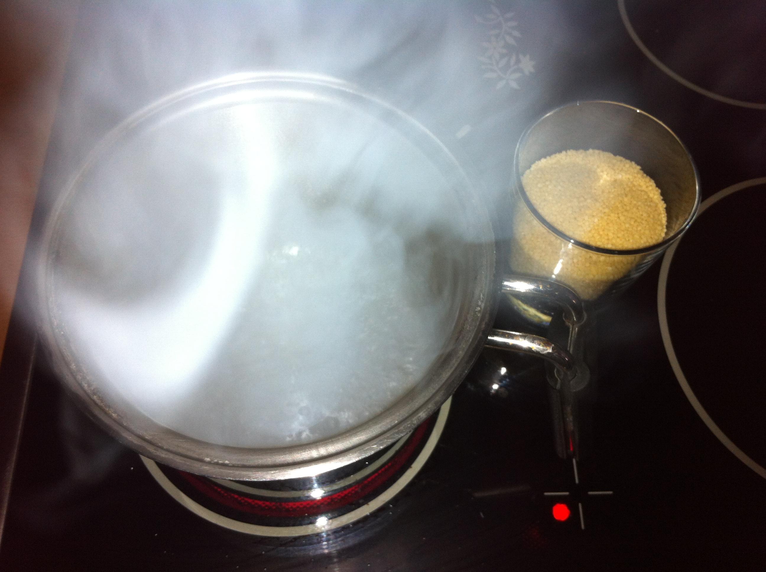 Quando a água começar a ferver, acrescente a mesma quantidade de cuscuz que de água (neste caso, um copo). Coloque um pouco de azeite na panela e mexa por alguns segundos. Depois disso, retire a panela do fogo, cubra-a e deixe descansar por alguns minutos.
