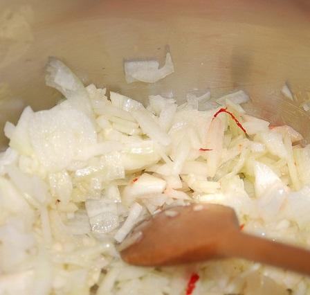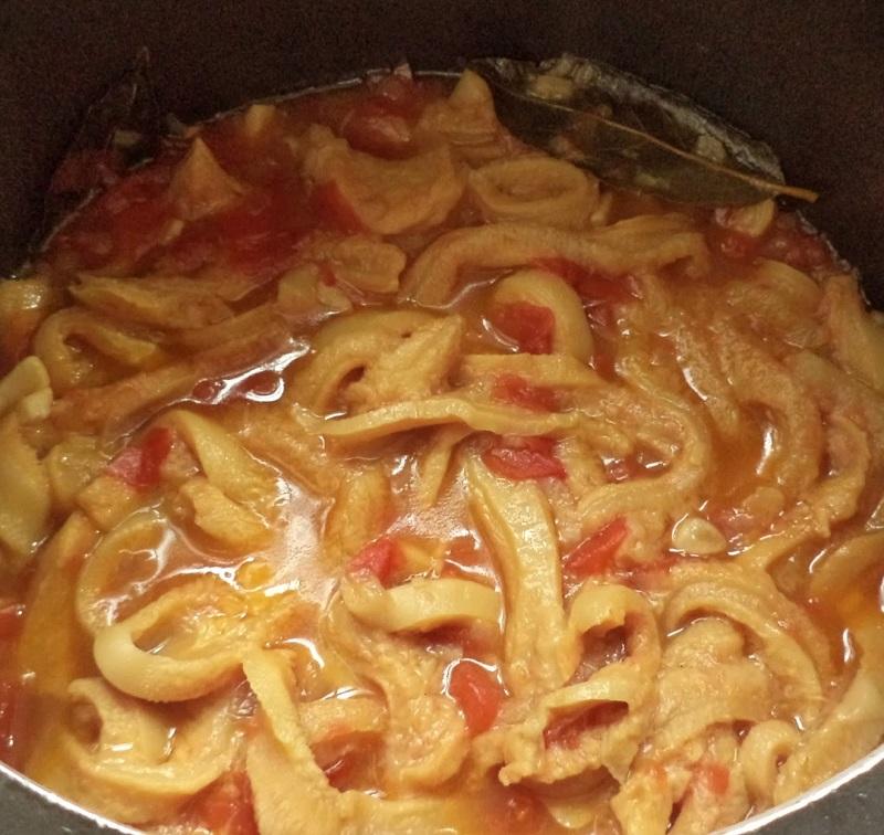 Em seguida acrescente o bucho e o feijão e tempere com sal e pimenta. Acrescente água e deixe cozinhar em uma panela de pressão durante cerca de 1 hora.