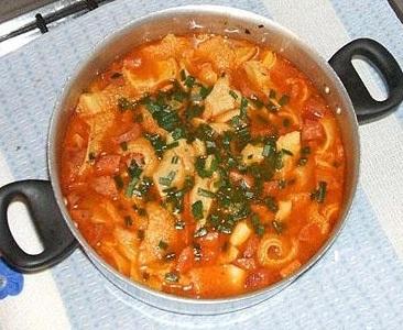 Numa panela à parte, frite a cebola picada em azeite com as folhas de louro e acrescente os tomates. Deixe fritar até que derretam e junte a linguiça cortada em fatias.