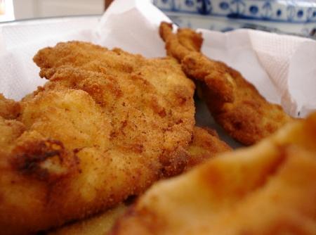 Passe os filés pela farinha de rosca, depois pelos ovos e novamente pela farinha. Coloque a fritar em óleo quente. Pré-aqueça o forno a 180º.