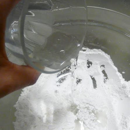 Em outro recipiente, misturaremos o açúcar de confeiteiro, a glicose e a água. É importante que a água esteja morna ou mesmo um pouco quente para que os ingredientes se integrem melhor. Caso tenha utilizado o chocolate branco em pó, após misturar estes ingredientes, acrescente-o. Lembre-se de que você mesma pode fazer o açúcar de confeiteiro.