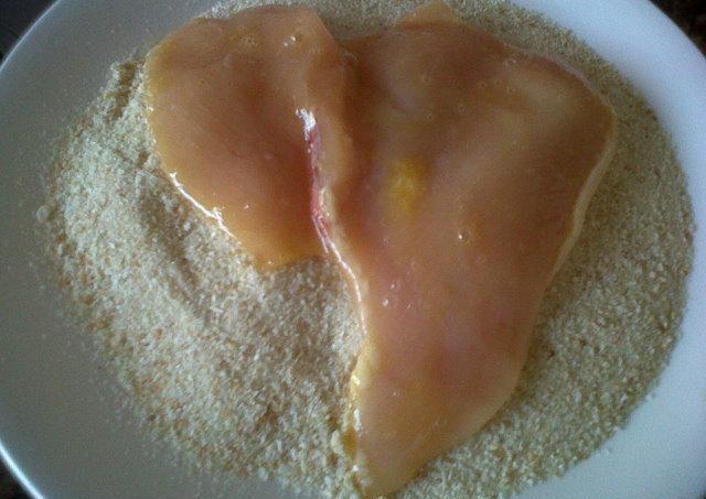 Em um prato plano coloque farinha de rosca. É aí onde vai colocar a carne passada pelo ovo para empanar. O melhor é fazer isso com as mãos certificando-se que fica bem grudada na carne, deve fazer isso dos dois lados. E o frango à milanesa já está pronto para cozinhar!