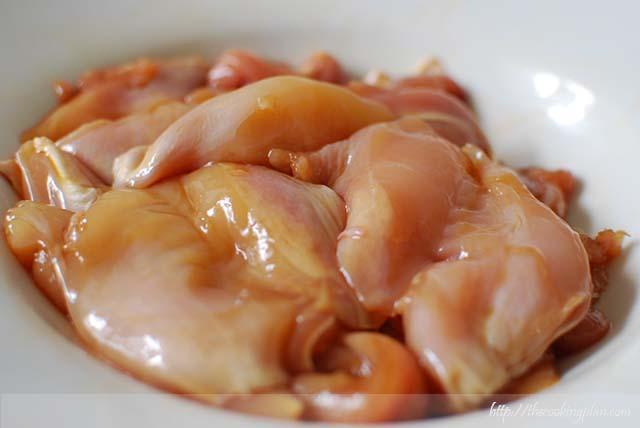 Coloque o molho de soja em uma tigela e macere o frango cortado em pedaços durante alguns minutos. Quando vir que está macio, será o momento de prepará-lo para empanar.