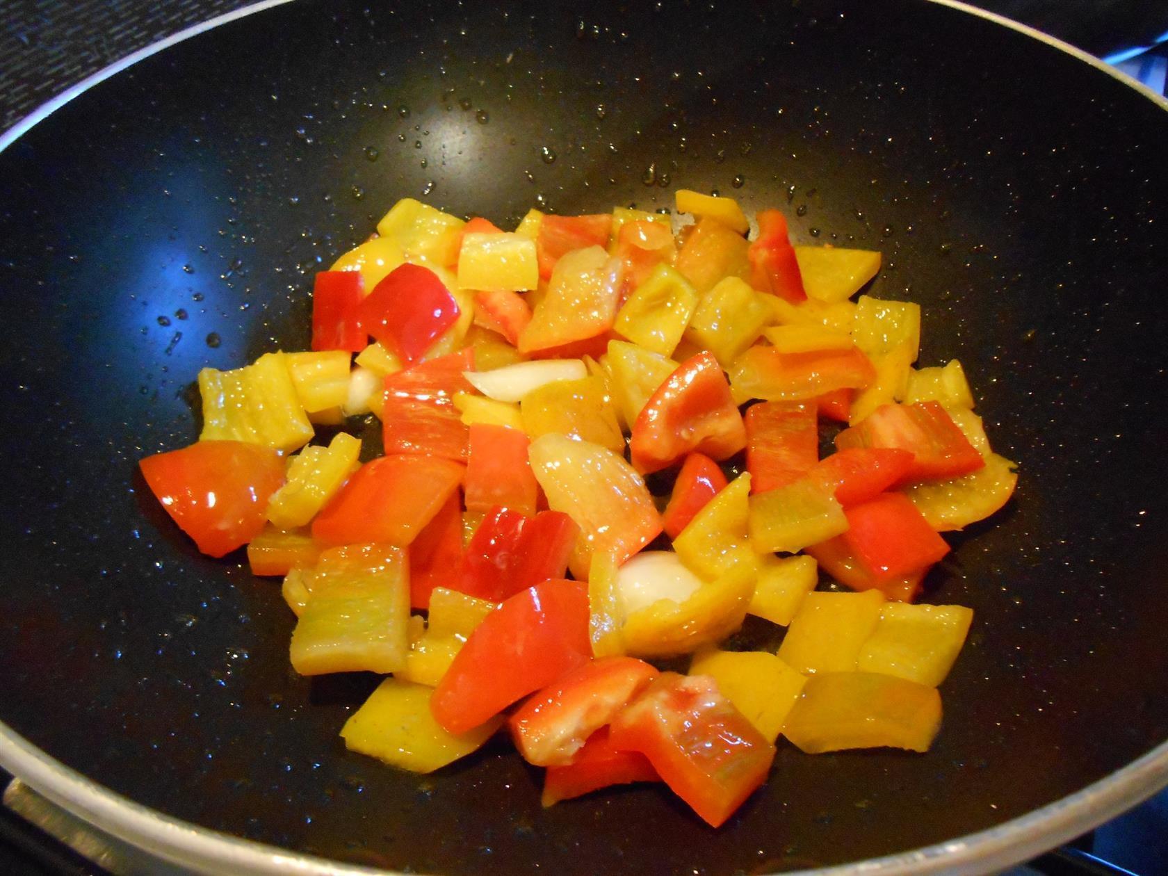 Ao mesmo tempo, refogue as verduras temperadas com sal e pimenta a gosto em outra frigideira para, em seguida, acrescentá-las ao prato de frango. Você deverá apenas refogá-las, pois o tempero final será dado pelo molho agridoce.