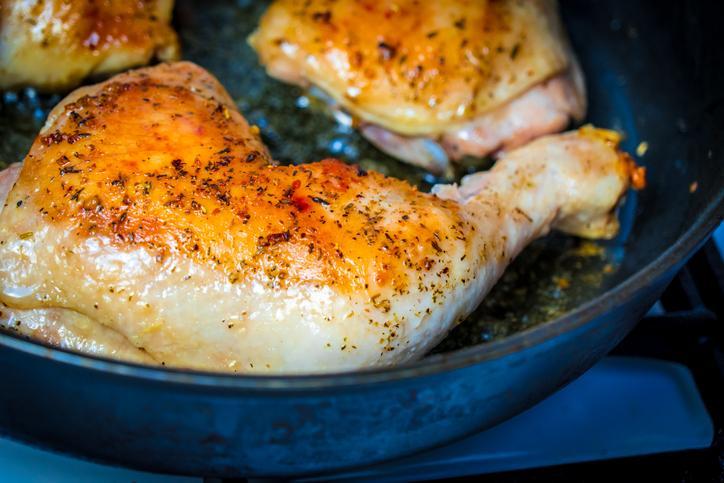 Aqui vamos te mostrar uma receita de frango ao molho barbecue sem a necessidade de usar o forno, ou seja, neste momento você deve preparar uma frigideira. Ligue em fogo médio, adicione um pouco de óleo na frigideira e coloque os pedaços de frango já temperados, sejam eles coxas, asinhas ou peito. Depois, adicione o molho de tomate e um pouco de ketchup.