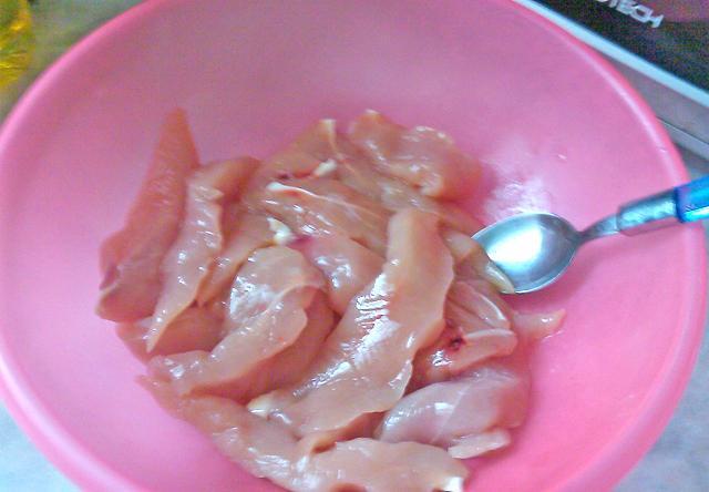 A primeira que você vai fazer é pegar em todo o frango e cortá-lo em tiras. A foto que se vê abaixo é a do frango cru, descongelado e como vem do mercado. Eu comprei cortado em pedaços, mas o ideal é cortá-lo ainda mais. As tiras podem ser feitas antes de fazer o marinado ou depois. Neste caso eu fiz depois, mas se quiser marinar e que pegue sabor mais rápido, então corte antes.