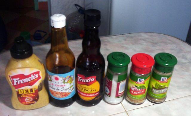 Depois prepare a marinada. Se você quiser, pode a fazer à parte, mas eu coloque tudo em cima do frango. Adicione o molho de soja, o molho inglês, a mostarda, o sal, a pimenta e o alho. O alho pode ser substituído pelo fresco, se quiser. Os produtos que usei foram esses que se vê embaixo. O sal está em uma embalagem que não é dele, mas não importa.