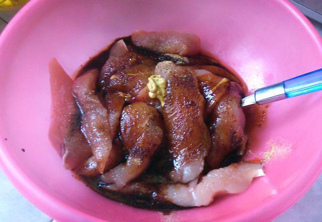 E aqui está o frango com a marinada. Deixe-o entre 30 minutos a uma hora. Se ficar mais tempo, melhor. Misture bem para distribuir tudo, tampe e coloque na geladeira todo esse tempo.