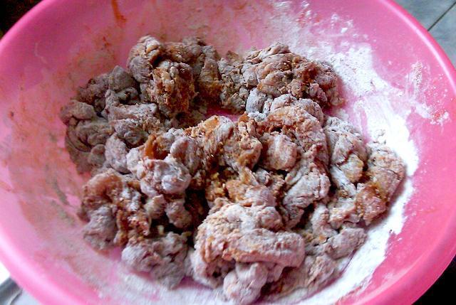 Quando tiver passado o tempo, retire da geladeira e adicione toda a farinha. Meça o máximo, que são 3/4 de xícara, mas se precisar mais ou menos para cobrir todo o frango, não tenha medo de usar o que for necessário. Como vê, o frango não tem que ficar totalmente branco, é apenas para que fique crocante na hora de fritar. É preferível fazer assim, ainda que fiquem grudados os pedacinhos de uns nos outros, porque se passar cada tira de frango na farinha uma por uma vai demorar tempo demais.