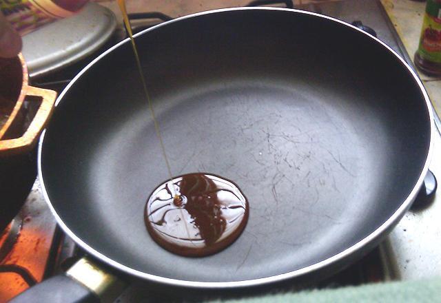Enquanto tudo frita, arrume uma frigideira e adicione aí o mel. A quantidade de mel também dependerá de você. Se quiser pôr mais porque quer mais doce, faça-o. Se quiser menos, também dá.