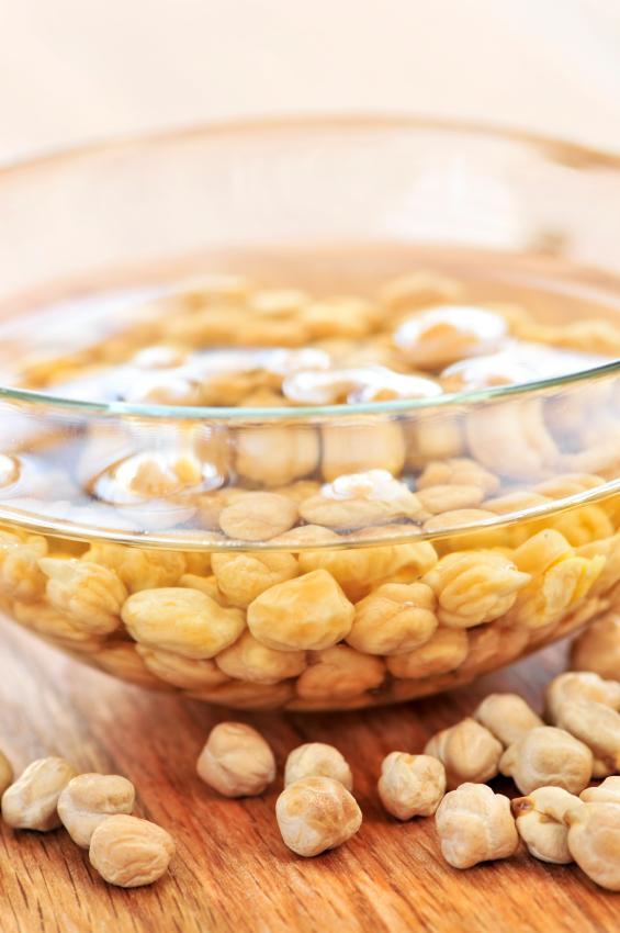 Além disso, se for utilizar grãos-de-bico secos, na noite anterior também deverá colocar em um recipiente com água para que passem umas 10-12 horas antes mergulhados e amoleçam antes de cozinhar. Deste modo, deverá se lembrar que ao colocar de molho o grão-de-bico incha e quase duplica o seu peso, por isso deverá usar metade da quantidade de grão-de-bico indicada na receita. Depois disso, já poderá colocar no fogo uma panela suficientemente grande com água e uma folha de louro para cozinhar o grão-de-bico.