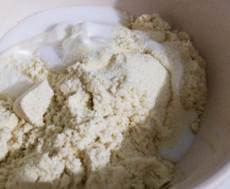 Numa vasilha média ou grande misture o leite em pó com o iogurte e mexa bem até obter uma pasta homogênea.