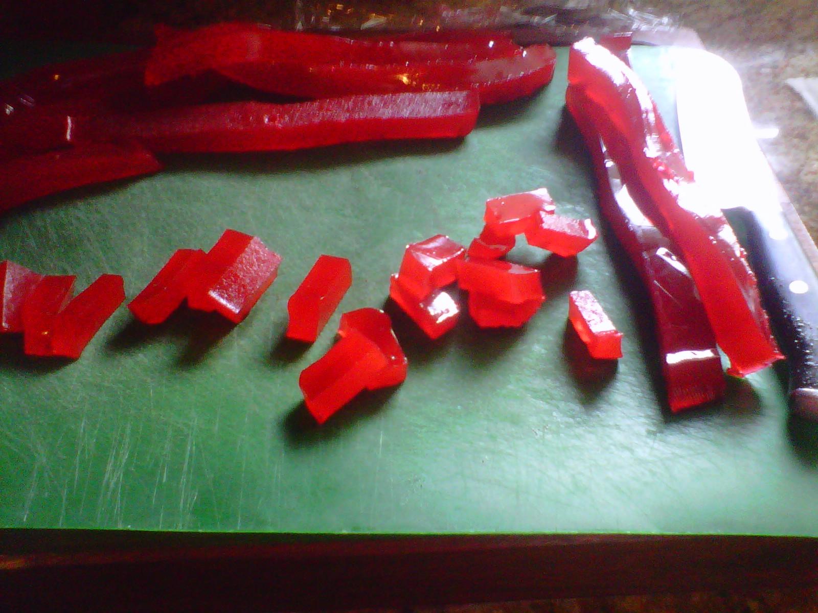 Quanto terminar o tempo de repouso, descole a jujuba do prato e coloque-a sobre uma superfície de corte. Pode cortar as jujubas com qualquer formato, desde quadrados, esferas ou até bichinhos se tiver paciência e habilidade.
