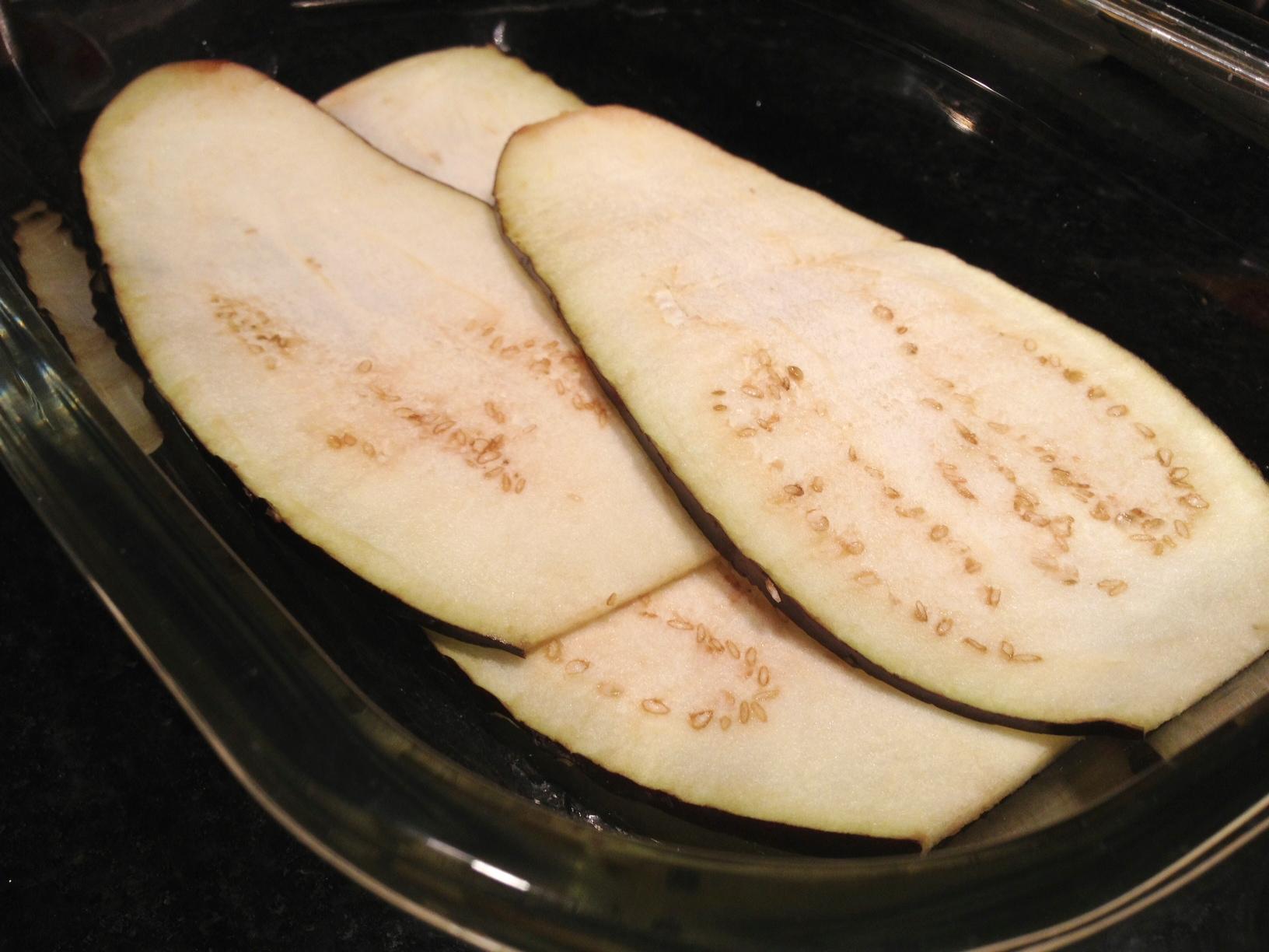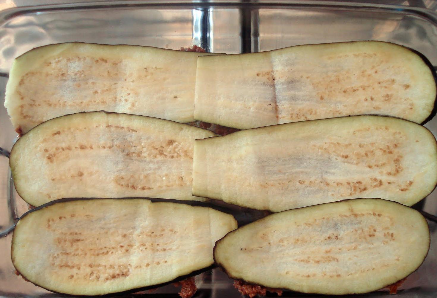 Pegue num refratário que possa ir ao forno e comece a montar a sua lasanha de berinjela, a primeira camada é de molho de carne e tomate. Depois deve colocar fatias de berinjela a cobrir o fundo e voltar a colocar o molho de tomate, depois cubra o molho com mais fatias de berinjelas. Faça camadas de berinjela e molho de carne até acabar as berinjelas, sendo que a última camada será de berinjela.