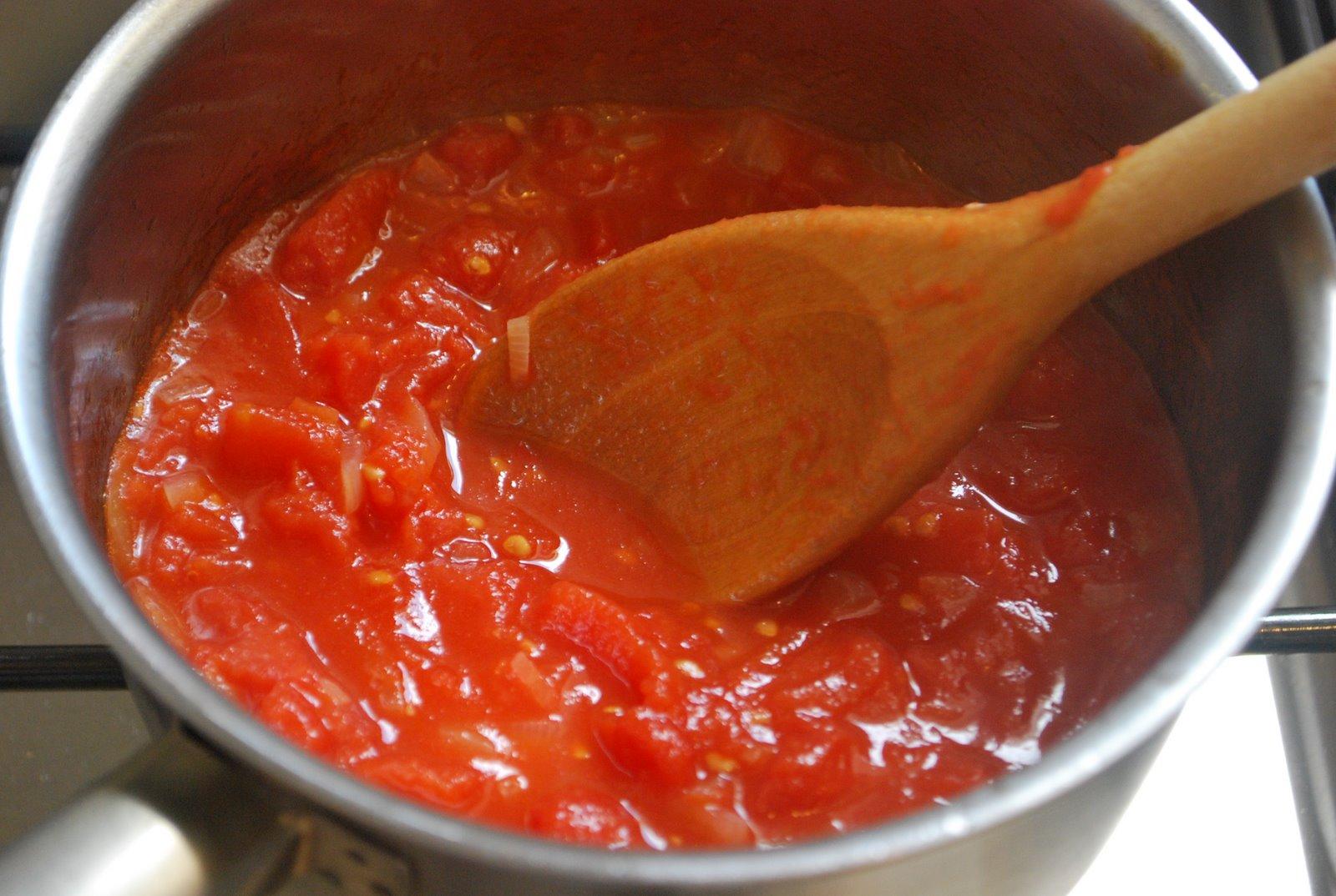 Escolha uma lata de tomate que já tenha os tomates picadinhos para você poupar tempo, deixe refugar um pouco e junte um vinho branco para refrescar o tomate.
