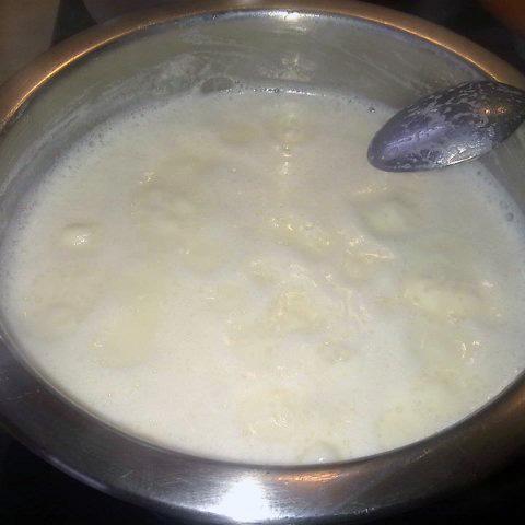 Pode utilizar uma colher de madeira ou batedeira manual para ir mexendo a mistura. Vigie para que não ferva, pois a ideia é esquentar o leite e que todos os ingredientes se integrem bem para que tomem a consistência adequada, não deixe cozinhar.