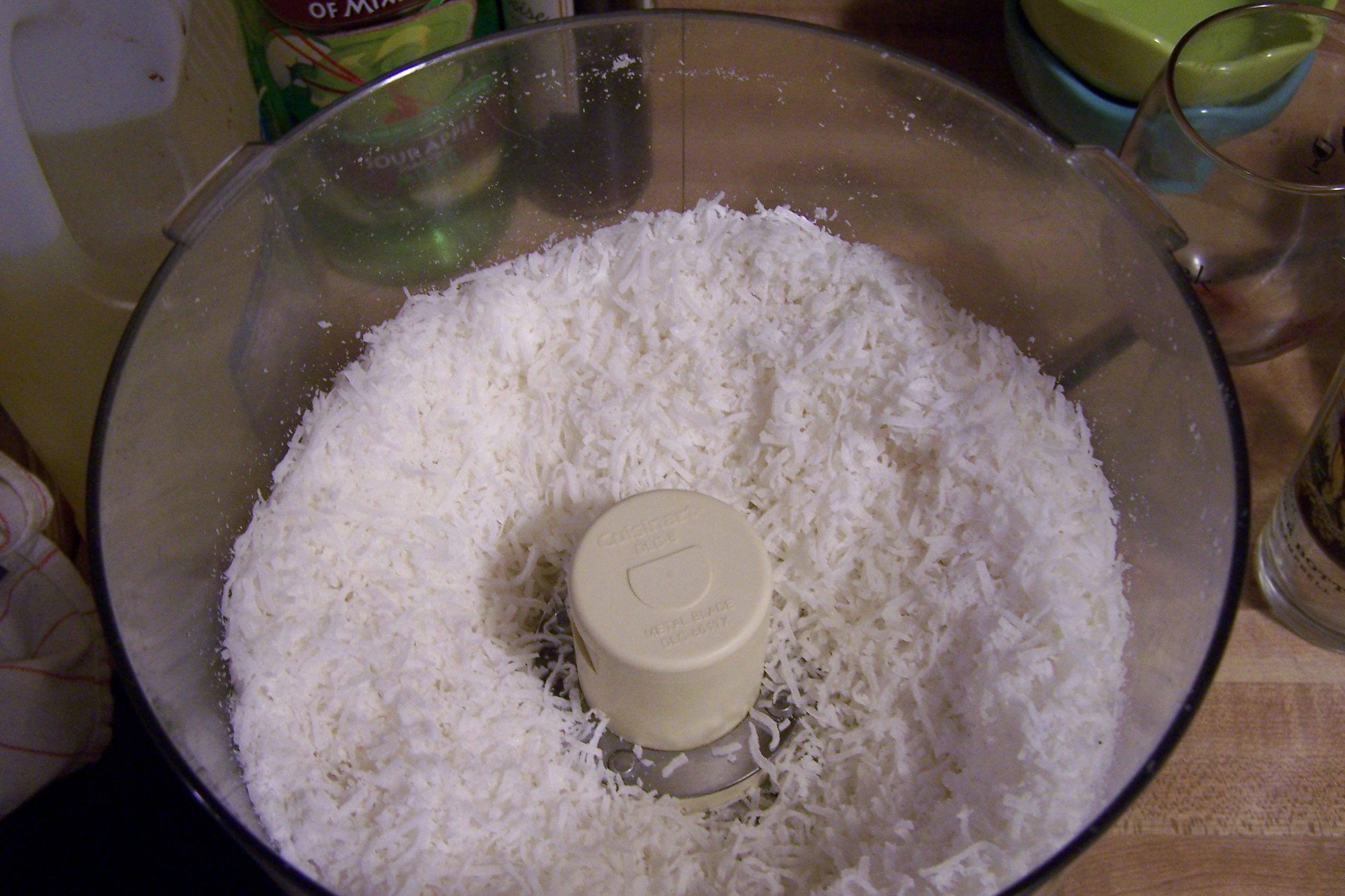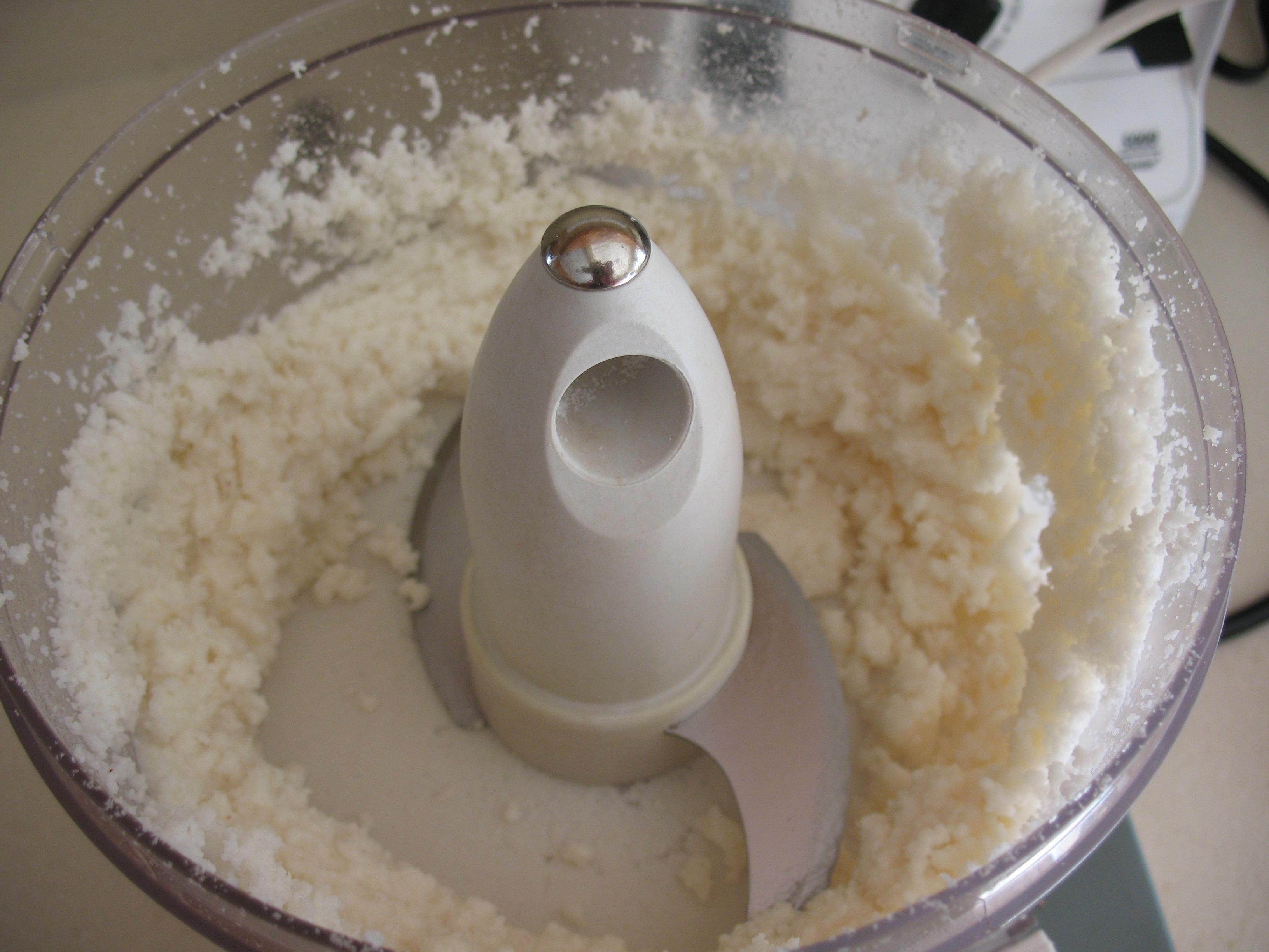 Bata a mistura até obter uma consistência semelhante ao do coco ralado industrializado.