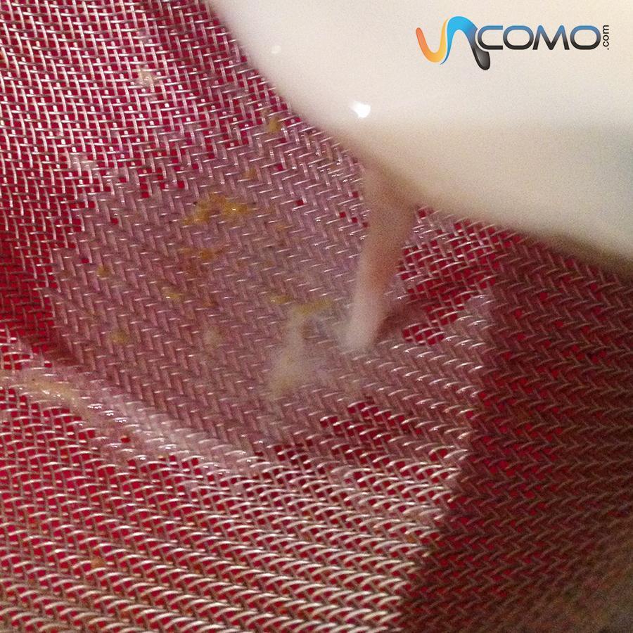 Quando o leite merengado estiver bem frio, retire do congelador e peneire para eliminar os restos de raspas e canela. Pode fazê-lo diretamente sobre o recipiente que usará para servir. Depois, incorpore as claras batidas e misture tudo. Se preferir uma textura mais líquida, use uma clara em vez de duas.