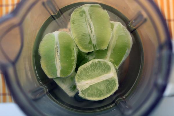 Primeiro corte em rodelas o limão ou os limões, depende da quantidade que você quer fazer, e coloque-os no liquidificador.