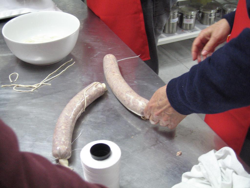 Assim que a tripa esteja completa aperte e gire alternando as direções. Amarre com barbante. Se notar presença de bolhas de ar nas linguiças, fure com uma agulha ou um objeto fino e pontiagudo para que o ar se solte.
