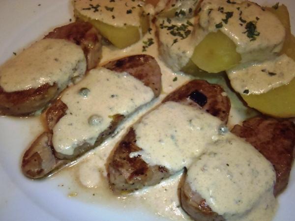 O prato de lombo com pimenta pode ser acompanhado por batatas cozidas ou assadas cortadas em rodelas.