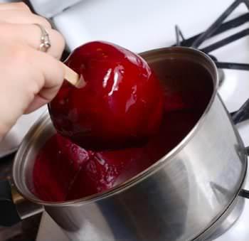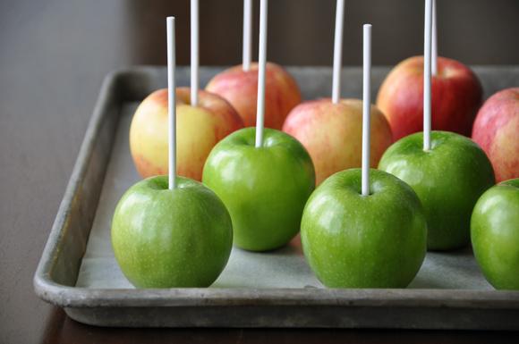 Quando levantar fervura, conte 15 minutos sem mexer. Enquanto isso lave muito bem as maçãs e insira um palito em cada uma delas, como na imagem.