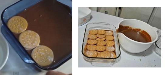Depois, adicione uma camada de bolachas maria cobrindo a camada de chocolate. Repita o procedimento até encher o recipiente, mas tenha em conta que a camada superior deve ser sempre de chocolate. Pode optar por decorar a última camada com ingredientes como chocolate granulado, amêndoas fatiadas ou bombons, ou deixá-la simples.
