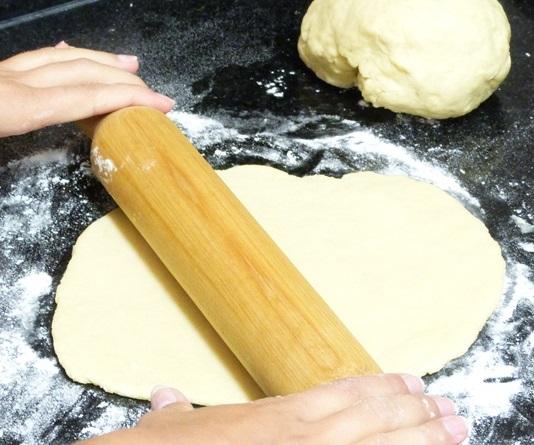 Agora, com a ajuda de um rolo, estenda a massa numa superfície lisa e enfarinhada até obter a espessura desejada. Não convém deixar fina demais pois pode partir durante a fritura.