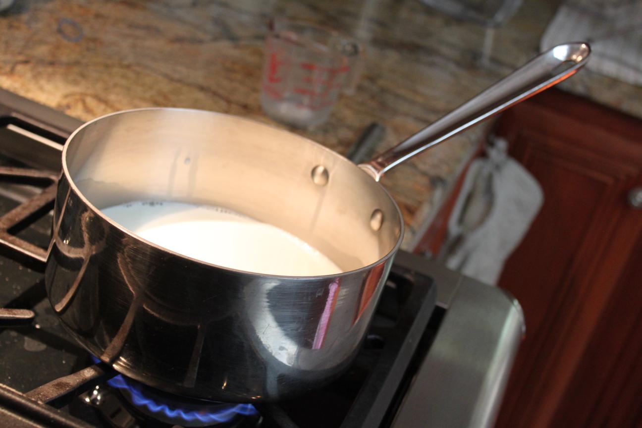 Para fazer mingau de tapioca, comece por colocar o leite (frio) numa panela.