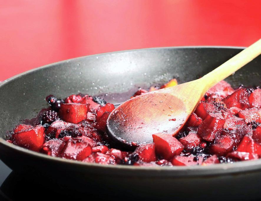 Agora que já conhece as frutas vermelhas desejadas, é o momento de começar a preparar o molho. Corte as frutas vermelhas maiores, como os morangos, coloque-os em uma frigideira e aqueça-os no fogo lento. Vá mexendo com uma colher de pau para que não colem entre si.