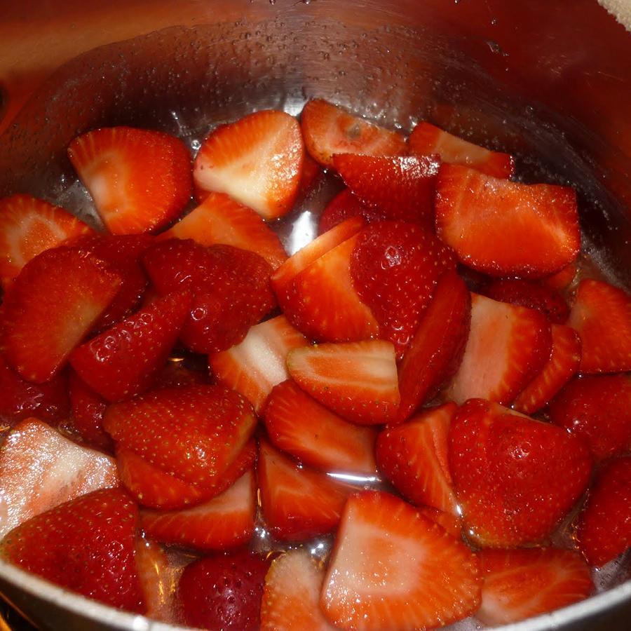 É importante mexer o molho com a colher de vez em quando. O molho de morango deverá adquirir uma textura similar à da geleia, mas não tão consistente. Se após este tempo os ingredientes ainda não tiverem misturado bem e não tiverem esta textura, deixe por mais uns minutos.