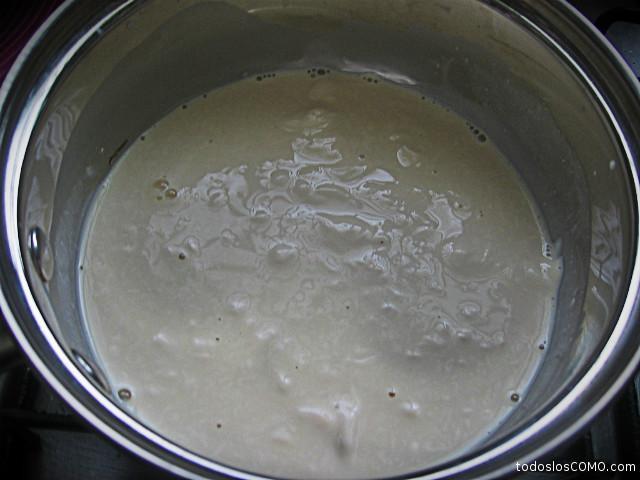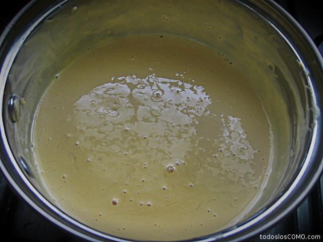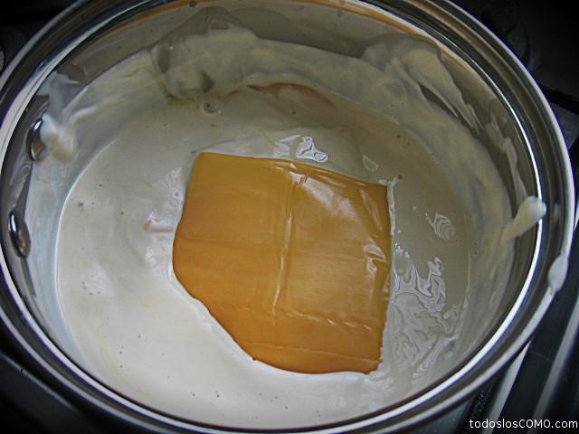 Agora quando estiver tudo derretido, o aspecto ficará como este da imagem de baixo. Não ficou muito espesso porque não usamos mais queijo, mas se quiser pode acrescentar mais. De qualquer forma, à medida que se esfria vai ganhando consistência.