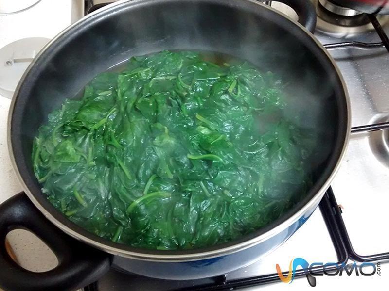Para fazer uma omelete de espinafre comece por lavar muito bem o espinafre, removendo toda a terra. Adicione um pouco de água e sal em uma panela e leve-a para ferver em fogo médio, quando atingir o ponto de ebulição, acrescente o espinafre e deixe-o cozinhar durante 5 minutos. Coe a água e deixe o espinafre escorrendo.