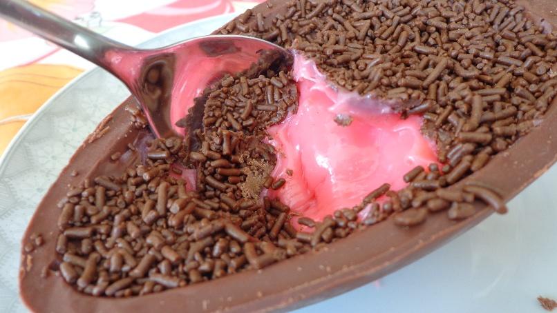Quem optou por fazer um ovo de Páscoa de colher ao invés de um ovo de Páscoa com a casca recheada deve preencher a casca do ovo até a borda com recheio de bicho de pé e então decorar com granulado e levar à geladeira.