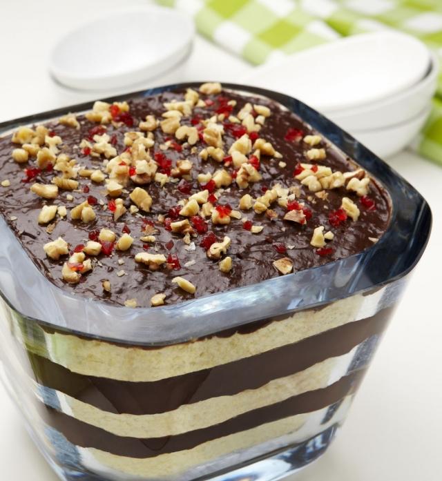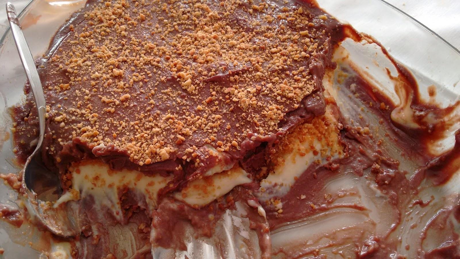Para finalizar, pique o chocolate ao leite e derreta-o. Depois espalhe o chocolate ao leite sobre o creme e leve à geladeira por 2 horas. Se desejar pode enfeitar com um pouco de castanha de caju ou paçoca, caso tenha escolhido esta última opção.