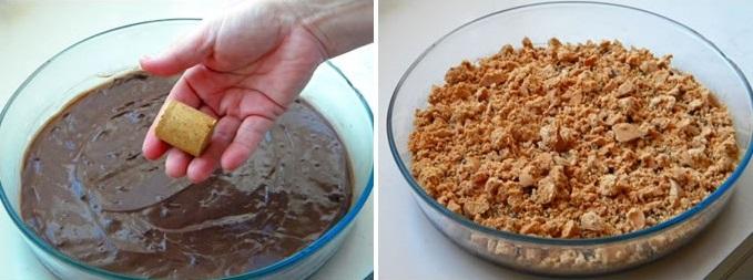 Pique a castanha de caju e faça com ela mais uma camada do seu ovo de Páscoa na travessa. Leve novamente ao congelador por cerca de 10 minutos e adicione mais uma camada com o creme de chocolate restante.