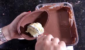 De seguida escolha o que pretende usar para rechear. Pode usar um tipo diferente de chocolate, cereais, doce de leite, coco ralado, entre muitas outras opções. Coloque o ingrediente de recheio no interior do ovo de chocolate e termine com uma camada do chocolate derretido que usou inicialmente.