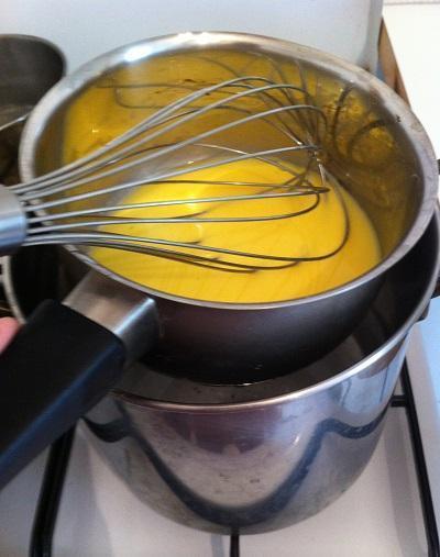 Depois da panela com as gemas de ovo estar em banho-maria a fogo baixo, vá batendo constantemente até que vá espessando. Acrescente pouco a pouco a manteiga e continue batendo.