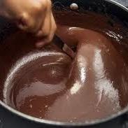 Faça o brigadeiro misturando o leite condensado, o chocolate e a manteiga em uma panela ao fogo, mexendo sempre.